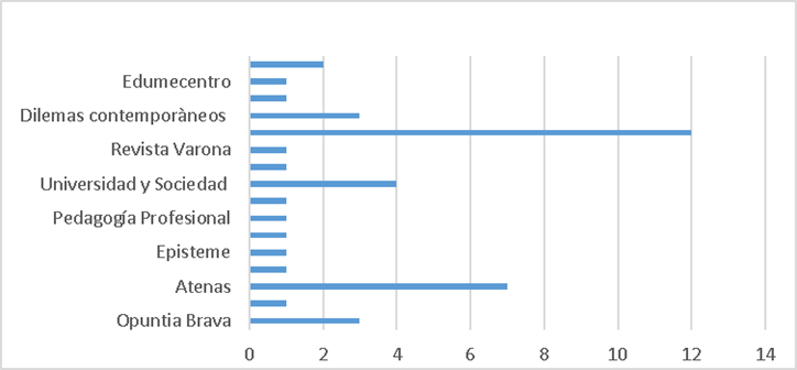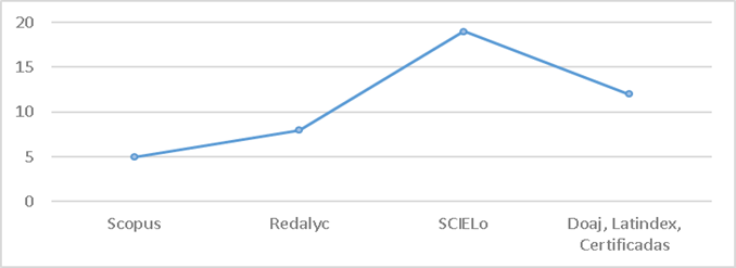 Los datos del gráfico 2b y 2c evidencian que un alto por ciento de los artículos se publicó en revistas indexadas en ScIELo, seguida de Scopus y Redalyc, mientras que el grupo de revistas de otras bases con visibilidad (Doaj, Latindex, y certificadas a nivel nacional) agrupadas en un 29,26%. La productividad de los egresados que han desarrollado trayectorias profesionales vinculadas a investigación/docencia/gestión evidencia que se articulan de manera cualitativamente superior las funciones y las nuevas actividades.