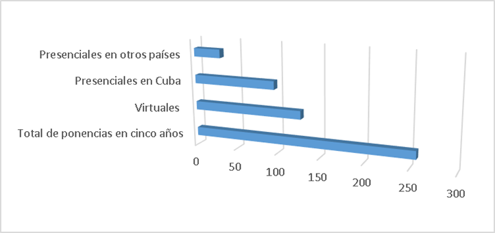 El gráfico 2d muestra el comportamiento de ponentes en eventos en cinco años, es uno de los indicadores más dinámicos, como se observa hay un alto por ciento de participación en eventos virtuales, correspondiendo con los años de pandemia de Covid 19, dado que la virtualidad se presentó como respuesta para mantener la vitalidad del programa, y se muestra insuficiente la participación presencial en eventos fuera de Cuba, en su mayoría solo posible para la mayoría de los doctorandos extranjeros (de los cinco, uno de ellos no participó), y un número inferior de cubanos, solamente dos, lo que representa un dato a considerar en las estrategias de formación.
