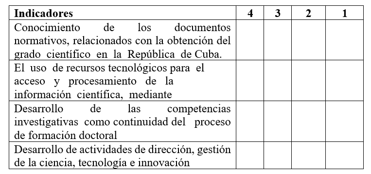 Crecimiento Intelectual: con criterios aspectos esenciales entre el conocimiento y la demostración práctica, que revela la apropiación creadora de conocimientos en el proceso formativo doctoral: a saber: conocimiento de los documentos normativos, relacionados con el proceso de obtención del grado científico en la República de Cuba; el uso de recursos tecnológicos que posibilitan el acceso y procesamiento de la información científica, desarrollo de las competencias investigativas como continuidad del proceso de formación doctoral, actividades de dirección, gestión de la ciencia, tecnología e innovación.