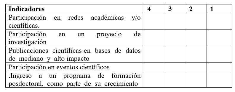 Crecimiento Profesional: se expresa en el proceso de devolución en la actuación sistemática para la mejora de la actividad en la cual se desempeñan y en su trayectoria académica, expresada en: participación en redes académicas y/o científicas, así como en eventos científicos liderazgo proyectos de investigación, publicaciones científicas en bases de datos de mediano y alto impacto.